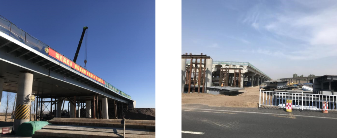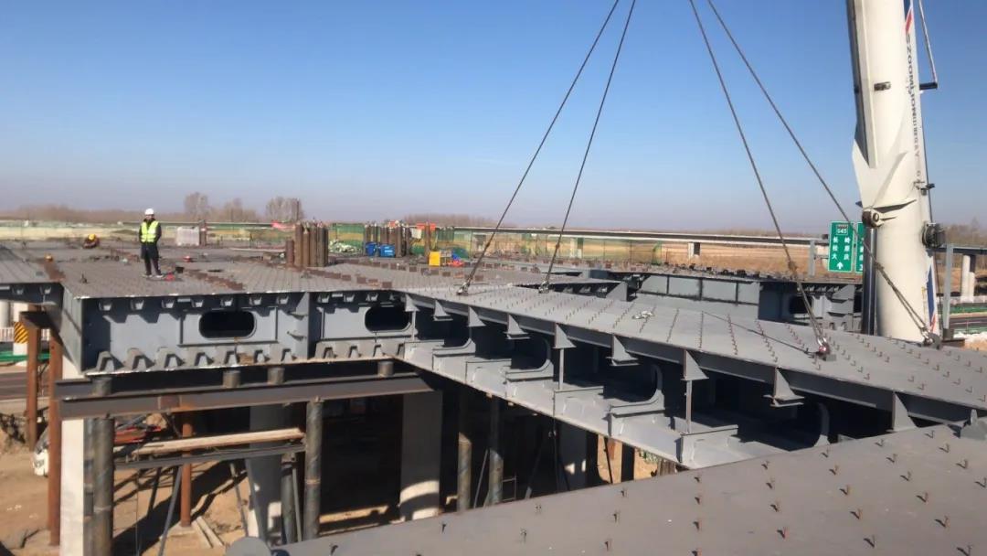 2018年10月,該項目順利完成了鋼箱梁首吊工作,其中敖卜互通均橫跨長深高速,協力互通XC匝道橫跨大廣高速,施工過程中既需保證高速半幅通車,還需保證過往車輛、施工人員的安全,施工難度極大,同時各聯段按照既定計劃實施存在較多變數,工期保證難度極大。為保證項目順利完成,在海波重科現場負責人胡劍濤帶領下,克服種種困難,與甲方密切配合,制定合理的、切實可行的聯段安裝計劃和可行的交通疏導方案,以保證長深高速、大廣高速車流順暢,同時做好安全防護工作;合理安排梁段安裝順序,選擇最優的吊車占位地點,提高安全性、減小安裝難度。
