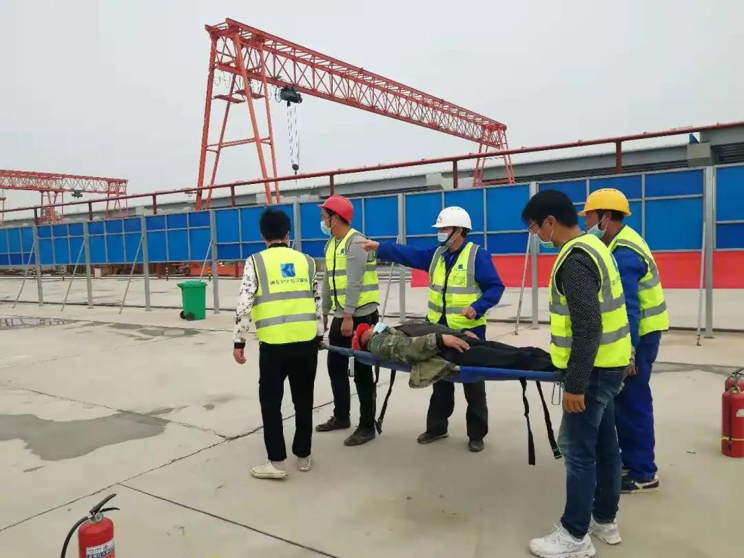 據本次消防演習負責人陳孝海透露,本次消防演練模擬疊拼場現場某作業人員在試用氣割時火花飛到油漆桶里使油漆燃燒發生火災,火勢迅速蔓延,引燃其它違章堆放的易燃品,工字鋼隨意擺放使其堵塞消防通道,火場內被困人員兩人。疊拼場啟動應急預案組織滅火自救并報119,將火撲滅。